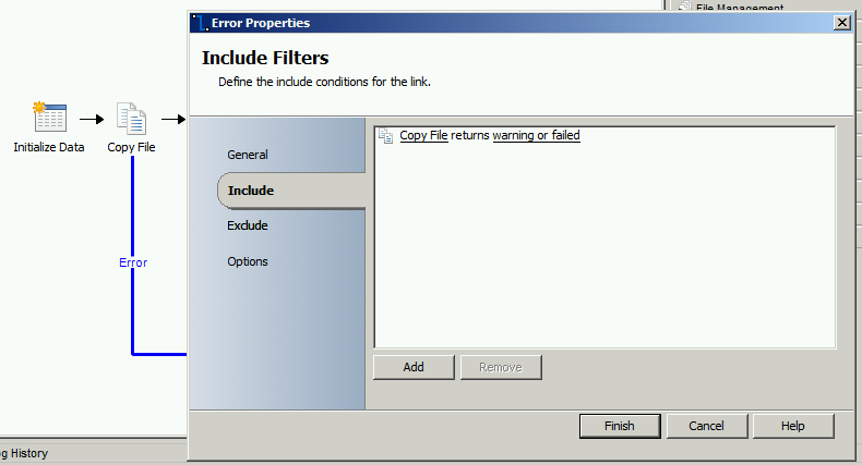One more important point to remember for the above pattern to work is that the links between the activities and “Return Error” activity must be configured as below such that the “Return Error” activity is executed only if there is a “error” or “warning” while executing the activity.