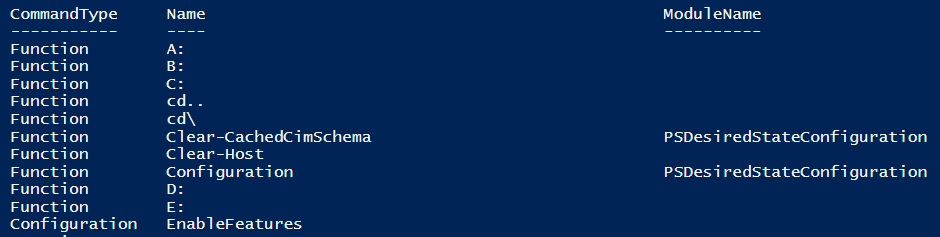 Within the result, “EnableFeatures” would be available within the list of functions obviously with commandtype of type “Configuration”.