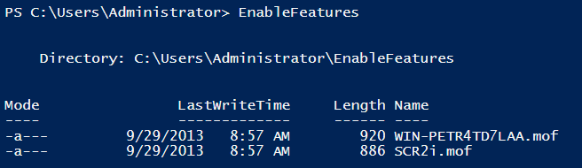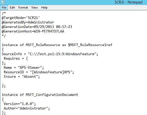 Within this directory 2 MOF are generates one for each target server. In this the example they are “WIN-PETR4TD7LAA” and “SCR2i”.