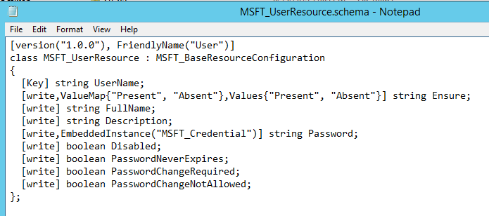 Essentially, the file is based on MOF standards and needs to be saved as <<ResourceName>>.Schema.Mof