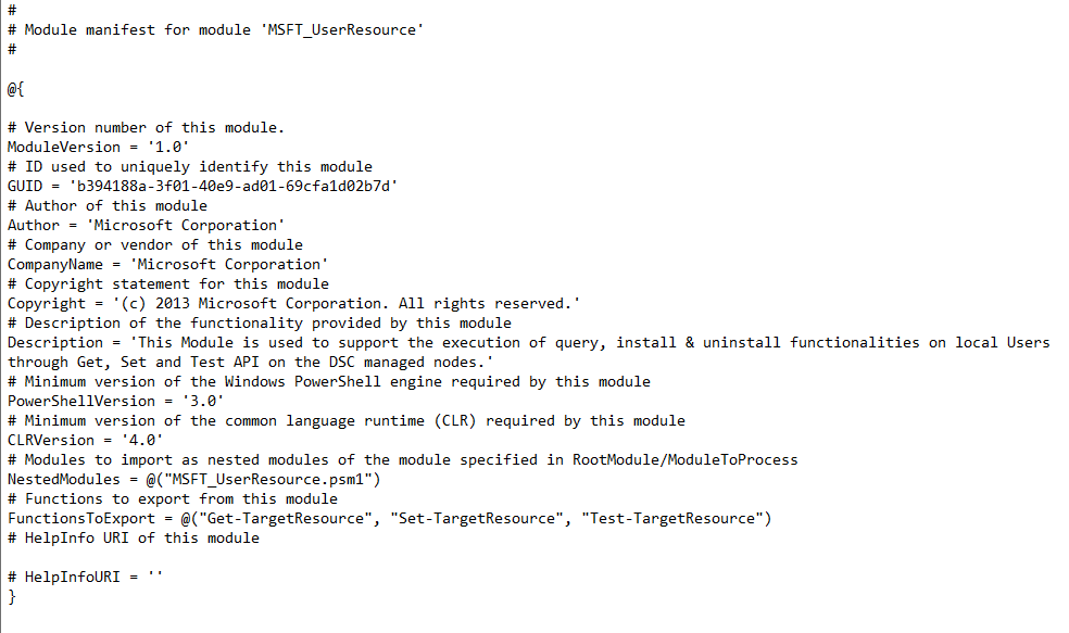 The third important file needed is the <<ResourceName>>.psd1. This is the Powershell manifest file containing information about the corresponding module.