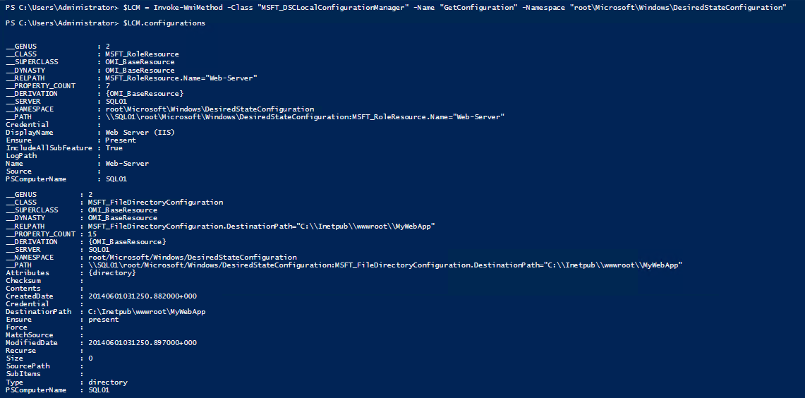 We can also use WMI Cmdlets to read the Configurations stored with DSC LCM. We can see in Image below that we are invoking a WMI method named “GetConfiguration” on class “MSFT_DSCLocalConfigurationManager” available in WMI namespace “ROOT\Microsoft\Windows\DesiredConfigurationManager”. The method returns an object having “Configurations” as property containing all the configuration stored with LCM.