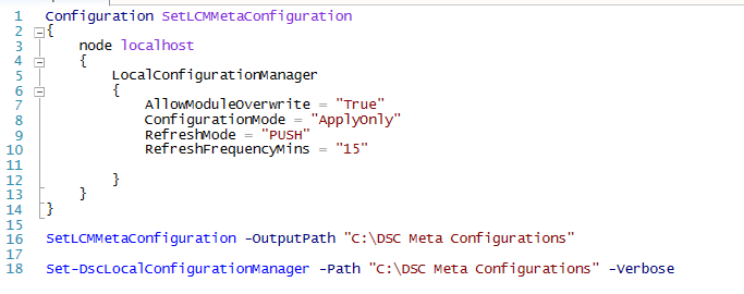 There is a special resource type named “LocalConfigurationManager” that should be used for the configuration of LCM properties. This resource type provides the same properties that we saw earlier post. These properties should be provided valid values to appropriate functioning of the LCM. Configuration scripts containing the “LocalConfigurationManager” resource type should not contain any other resource type.