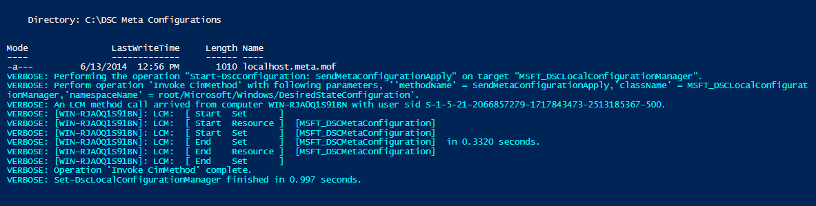 We execute the Configuration script in the same script scope as configuration definition. As a result, a MOF file is generated at the location specified by the “OutputPath” attribute. After the MOF file is generated, Set-DscLocalConfigurationManager cmdlet is used to assign the configuration information to the target node’s LCM meta configuration properties. We have used the verbose switch for better understanding of underlying action taken by DSC.