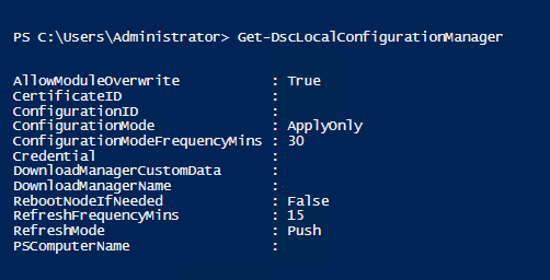 As a result of execution of the script, the final LCM meta configuration changes and the new configuration is shown below. Note that the values we mentioned in Configuration script before are now reflected within properties of LCM meta configuration. Below, we can see that when we run Get-DSCLocalConfigurationManager on the same machine, the output reflects the new property values.