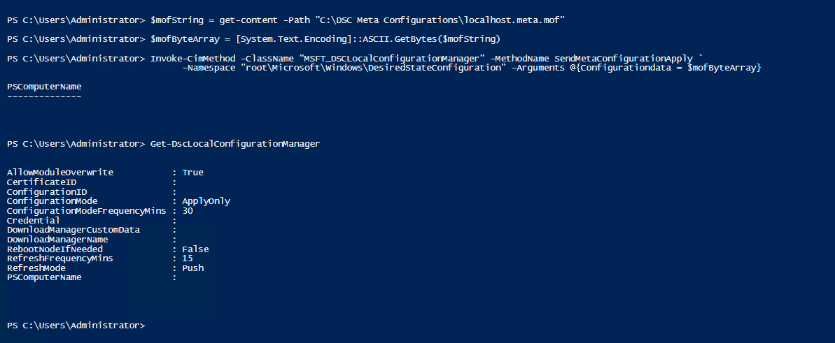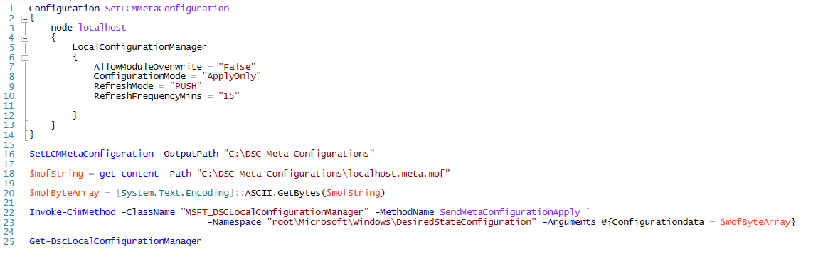 We already saw that LCM is implemented within a class named MSFT_DSCLocalConfigurationManager”. This class has methods that implements the behavior of LCM. One of the method of this class is “SendMetaconfigurationApply”. It accepts a single argument named “Configurationdata” of type byte array. The method is responsible for updating and setting up the properties of the LCM meta configuration.