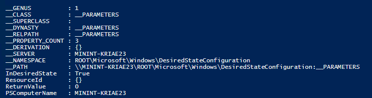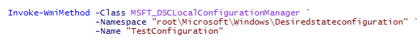 We can use WMI Cmdlet to test the Configuration. We can see in Image below that we are invoking a WMI method named “TestConfiguration” on class “MSFT_DSCLocalConfigurationManager” available in WMI namespace “ROOT\Microsoft\Windows\DesiredConfigurationManager”. This method has two output parameters. “InDesiredState” results into true or false depending whether there is a configuration drift. “ResourceID” does not return any value and is empty.