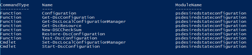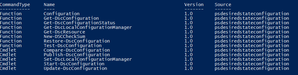 The following command can be executed on each of the DSC versions to view the cmdlets available.
