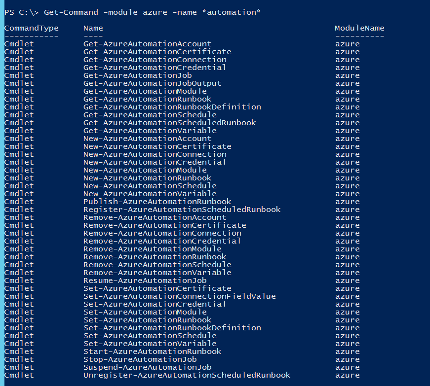 You can also execute the below command to get all the available cmdlets belonging to Azure Automation.