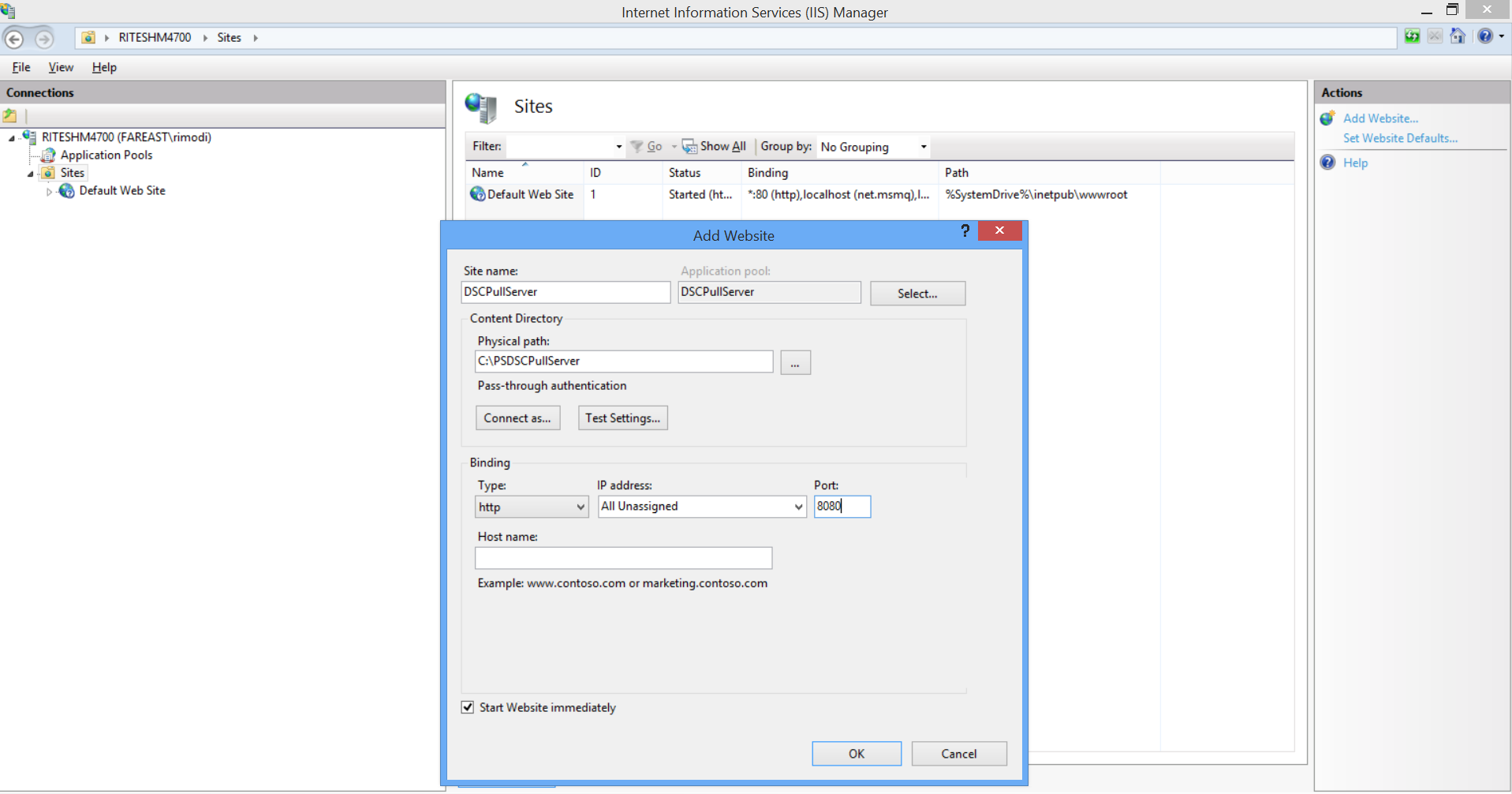 Click on Sites in IIS Manager and then Add Websites. In the resultant dialog, provide “DSCPullServer” as Website Name. Also choose the earlier created “DSCPullServer” Applocation pool. Provide the physical path “C:\PSDSCPullServer” created earlier. Provide the Port number as 8080. Note that these values are all configurable and the reader can provide their own values.