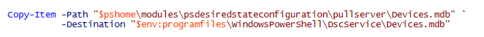 In Pull Mode, DSC stores all the configuration information and the target Nodes information in a Database called Devices.mdb. This file is also installed when the DSC-Service was enabled. There is another folder “DSCService” created while enabling “DSC-Service” at folder location “C:\Program Files\WindowsPowershell\”. We will copy and place the Devices.mdb file within the “DscService” folder.
