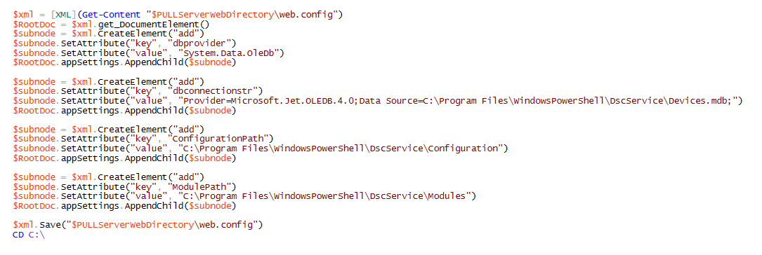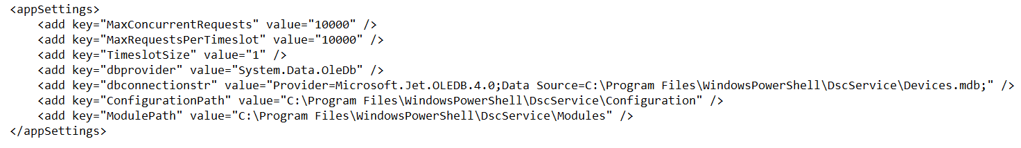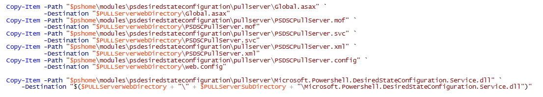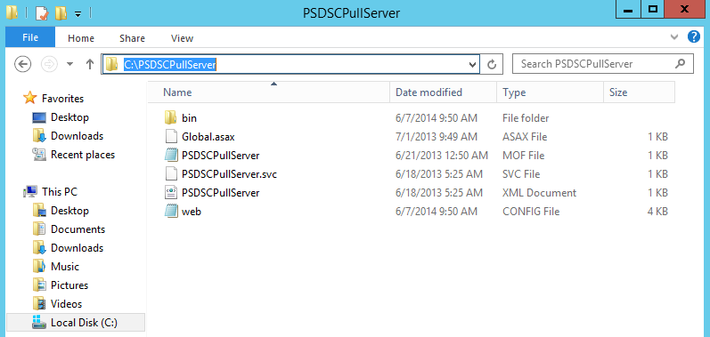 Also, copy “Global.asax”, “PSDSCPullServer.mof”, and “PSDSCPullServer.svc”, “PSDSCPullServer.xml” and “PSDSCPullServer.config” files from “C:\Windows\System32\WindowsPowerShell\v1.0\Modules\PSDesiredStateConfiguration\PullServer” to “C:\PSDSCPullServer” folder. These are core asp.net files needed for a functioning asp.net web application.