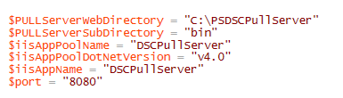DSC Pull server is essentially an IIS Website that accepts configuration requests and responds with configuration details. We will have to build IIS website that will act as DSC Pull server endpoint. It then follows that we will be needing a physical directory mapped to IIS website. An Application pool would be needed to run the website and configure them with appropriate values. In Powershell, we would be created few more variables to hold these values shown in Figure 5. These variables refer to website physical directory path “C:\PSDSCPullServer”, a sub-directory within named “bin” needed by web applications storing assemblies, the name of the application pool “DSCPullServer” to be created and associated with the website, “4.0” as application pool dotnet version, “DSCPullServer” as name of the website and port 8080 as website port number.