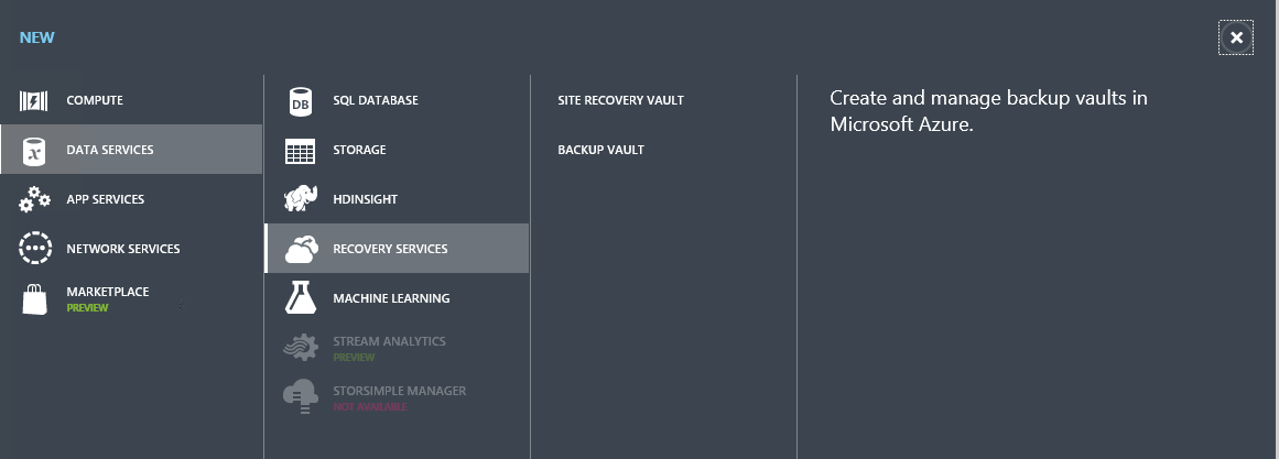 Login to the Azure Subscription and click on “Recovery Services” and then “New” button available below the left menu. It would slide out the option to create a new Vault for Site Recovery. This is shown in below screen