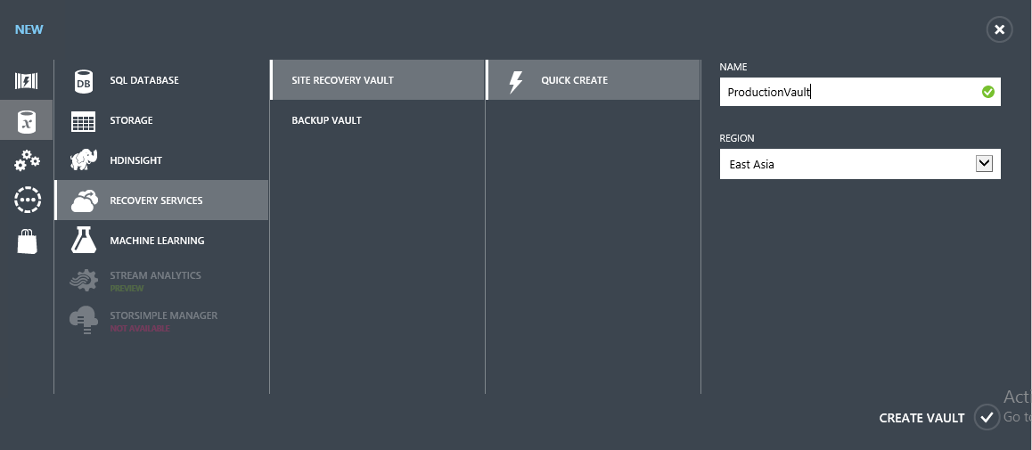 Click on “Site Recovery Vault” -> “Quick Create to create a new vault for Site Recovery. This is shown below.