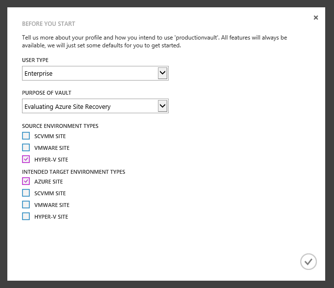 Choose “Enterprise” for Usertype, “Evaluating Azure Site Recovery” as purpose of vault, “Hyper-V Site” as Source environment and “Azure Site” as Target environment. This is because we want Azure to act as out Disaster Recovery site and click the “Complete” button.