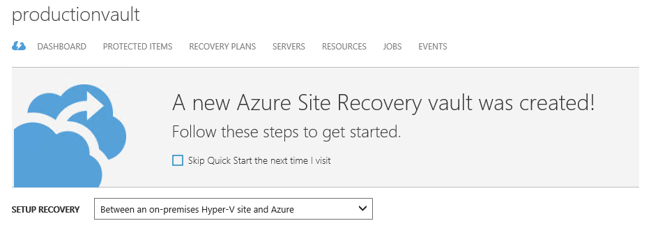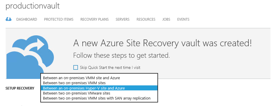 Note that Setup Recovery is already set to “Between an on-premises Hyper-V site and Azure”.