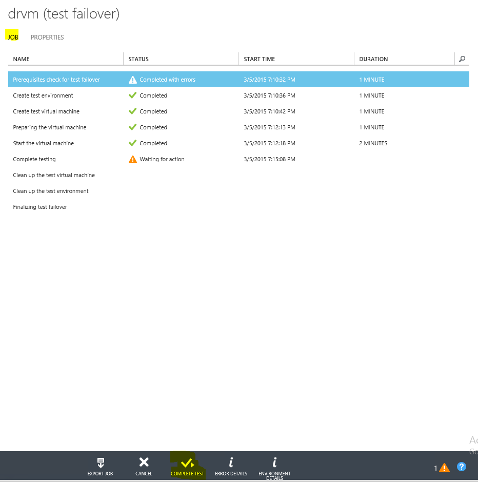 TO complete the failover test, navigate to the job specific to failover test from Azure site recovery service -> jobs and click on “Compete test” button when status is shown as “waiting for action” for complete testing step.