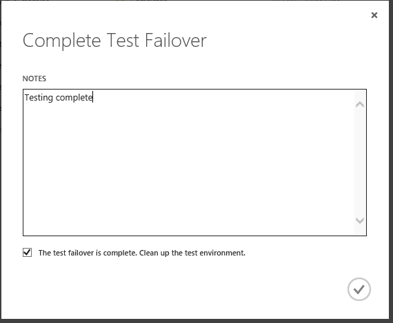 This would popup another window asking whether clean up should happen as part of completing the test. If we mark yes for this checkbox, the cloud service, virtual machine, storage container and blob file created earlier would be deleted and azure would be back to its original state. During the entire failover test process, the on-premise virtual machine can continue to run without any downtime.