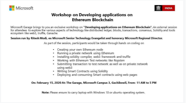 Organized and delivered by Ritesh, who is Blockchain expert and Honorary Microsoft Regional Director.