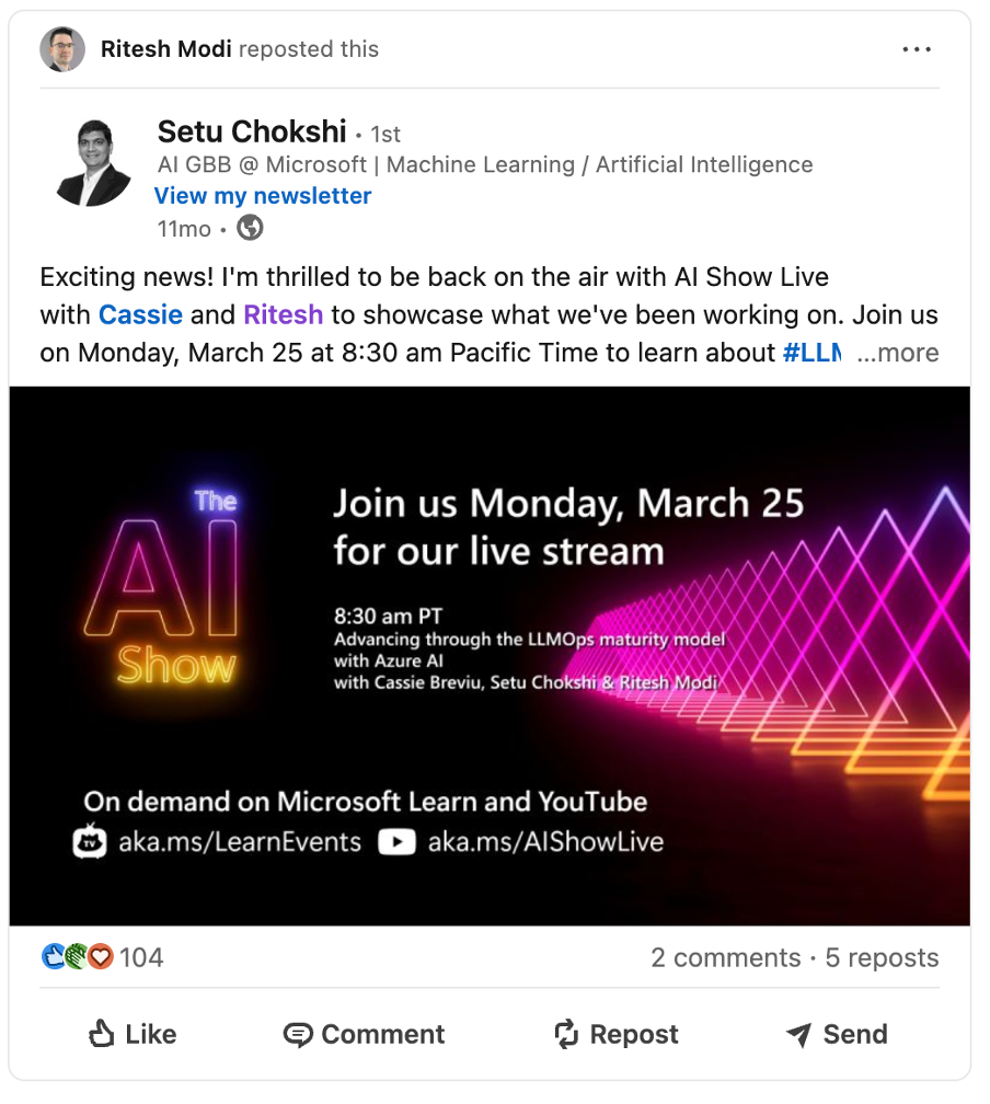 The AI Show, hosted by Seth Juarez and Cassie Breviu, is an engaging YouTube series showcasing the remarkable work happening in the field of artificial intelligence at Microsoft. Developers, aspiring developers and technical experts can tune in to learn about cutting-edge AI technologies, explore practical applications, and stay updated on the latest developments in Azure AI.